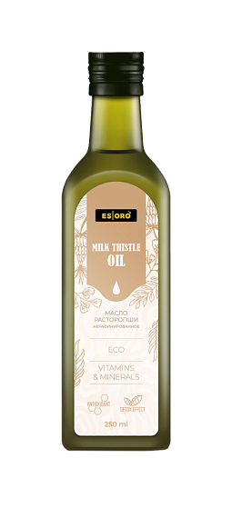 Unrefined milk thistle oil retains all the valuable properties of the plant and a rich set of nutrients. You cannot fry or stew meat with this oil, as it immediately loses all its beneficial properties, so it should be used when dressing salads, adding to soups, and preparing baked goods. ESORO milk thistle oil is a source of valuable fatty acids, vitamins and antioxidants. This is a natural oil without unnecessary additives or chemical processing, which makes it an ideal choice for those who strive for a healthy lifestyle.