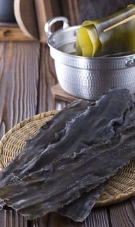 Healthy and low-calorie product. They are used in the cooking of salads, soups and other Asian dishes. Dense sheets of the same size have a standard green-brown color. Kombu cannot be washed; they must be wiped with a dry cloth and soaked for four hours. The water in which the kombu was soaked is added to the miso soup broth.